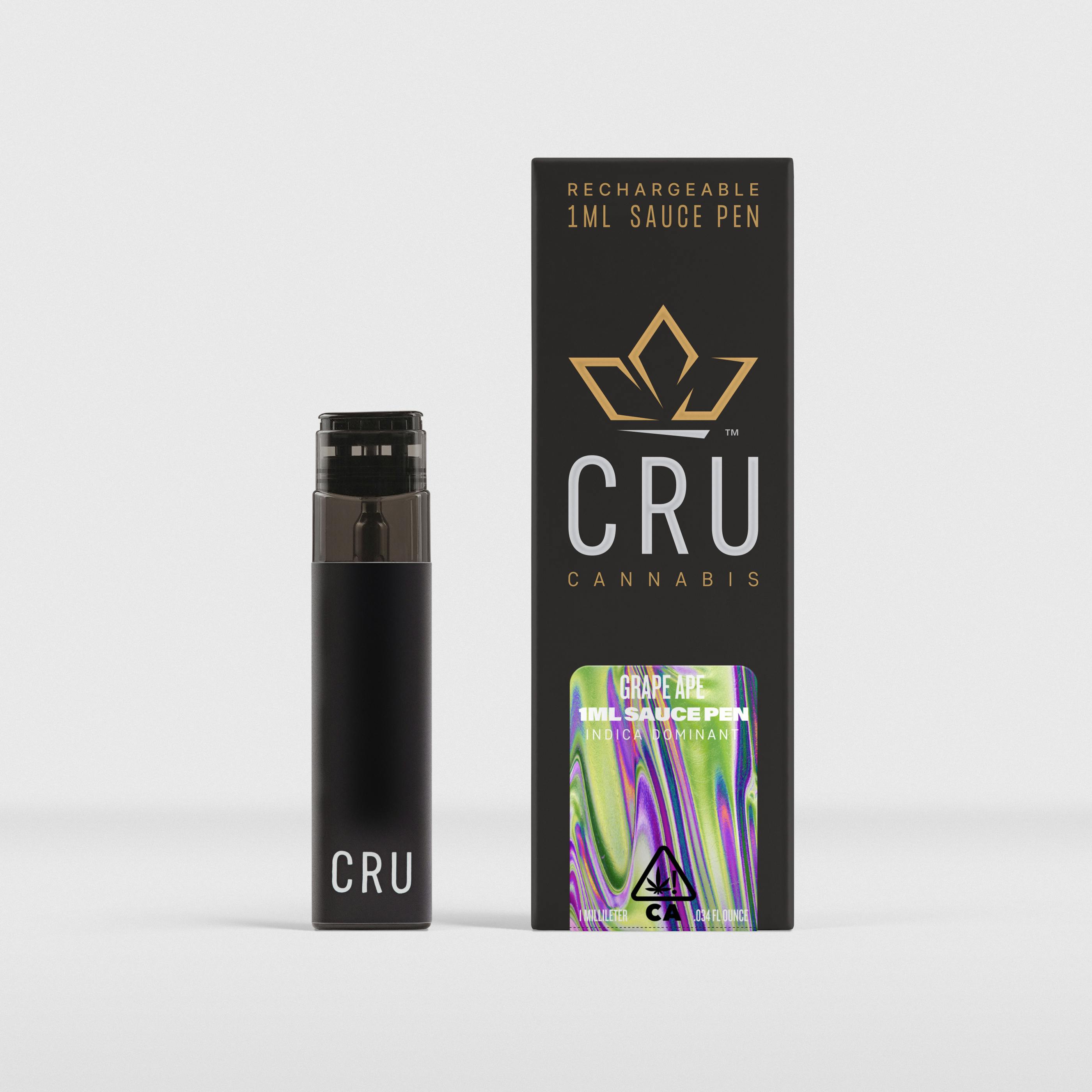 Grape Ape 1ml Rechargeable Sauce Pen TASTE + SCENT Grape, Fruity Spicy, Sweet SENSATION Euphoria, Happiness Relaxing, Sleepy WHEN TO USE Nighttime Indica Introducing CRU's brand new rechargeable sauce pens! The perfect balance of potency, smoothness, and REAL cannabis flavors made possible only with CRU's special blend of selectively extracted HTE (High Terpene Extract) and HCE (High Cannabinoid Extract). Every puff is packed with all natural cannabis derived terpenes and cannabinoids working together to create “The Entourage Effect” that provides the unique strain specific sensations we all love and enjoy.